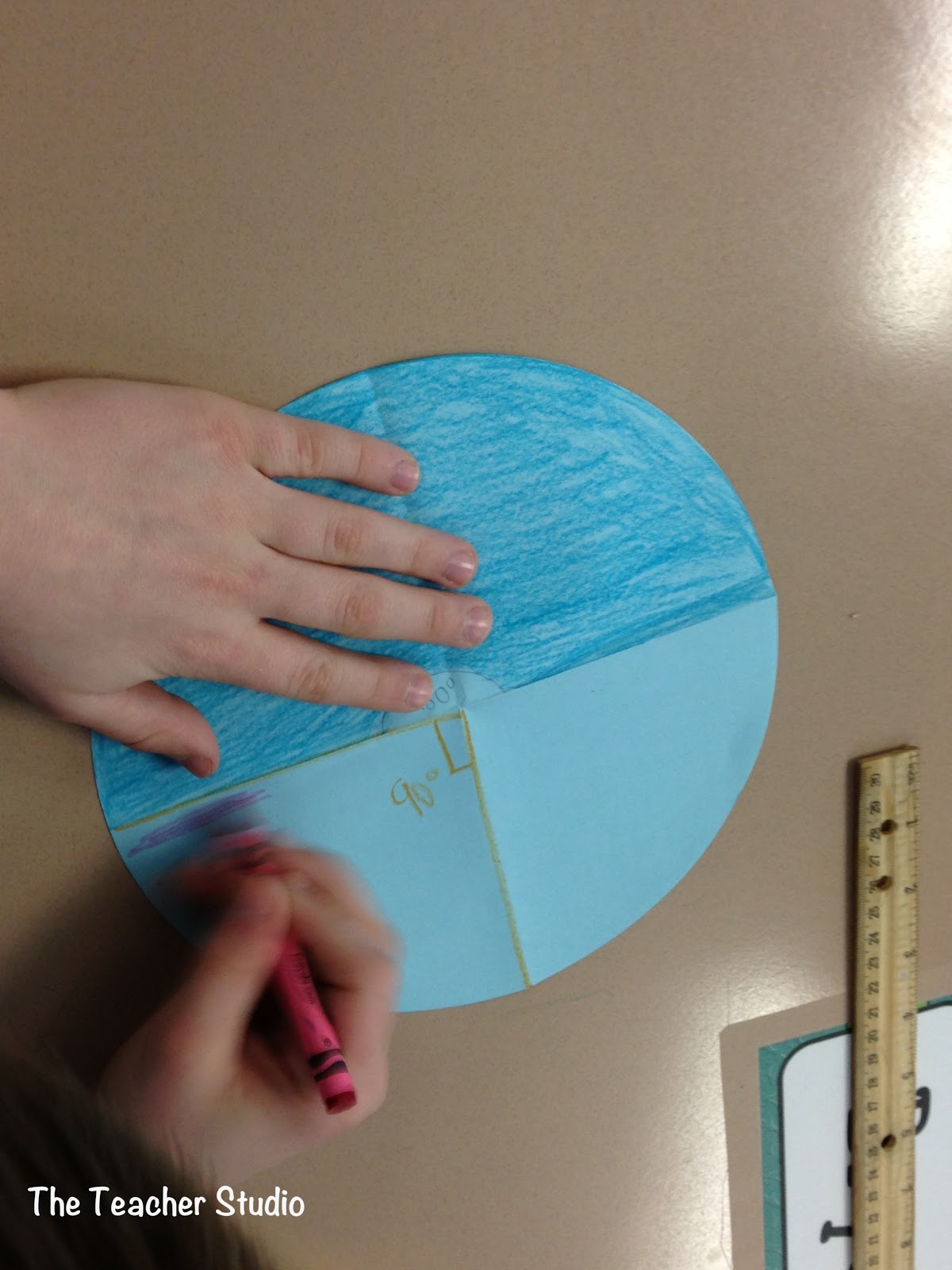 I had students label half of the circle 180 degrees and then had them shade it in. I then asked them to talk to a neighbor about what would happen if we folded it AGAIN. Students were pretty quick to realize that half of the 180 was the right angle we talked about yesterday. We folded the circle again, marked half of the blank section as 90 degrees and shaded it a new color. Students knew immediately that these were fourths, so we talked about how four, 90 degree angles would add up to 360 degrees, 2 of them would be