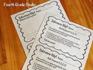 I often create a bunch of these entrance slips to use as I plan any given unit–but I also create them “on the fly” when I feel the need to take the temperature of the class. I keep a bunch of easy to use slips that work for any subject copied and ready to use.