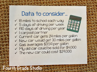 I simply typed up all the “number stuff” I could think of that might impact my decision. It would be easy enough to do this (took me 3 minutes) and to share it with your class and/or a small group. Students might have questions like “Why is your carpool partner on there?” (I would ask–why do YOU think so?) or “What does “averages” mean? (I would ask–what do YOU think) until students have a decent understanding of the facts on the page. So you might be thinking–what’s the answer going to be? How are you ever going to get ALL your students to come up with it? Can fourth graders really handle this?