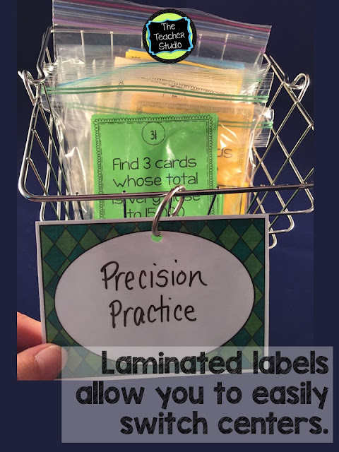 As we pass the halfway point in our school year, one thing that is often a year-long issue is keeping all the math “stuff” organized! If you are doing any small group work, you know that pieces and papers and parts can end up all over the place! Here are a few tips that might help things run a little more smoothly-and save you and your students a little time and frustration. Don’t get me wrong…I have dice and counters ALL over my room–but if I didn’t have a FEW systems in place, my room would be an even bigger mess!