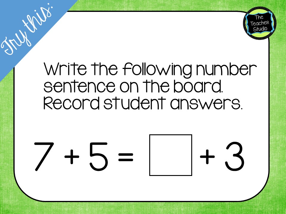 One of the tasks I mentioned in that post is one of the first math questions I give at the beginning of the year. It really helps me take the temperature of my class and their understanding. See how many write “12”, how many write “15”, or if any write “9”. It is so telling about how we present number sentences to children from an early age. Anyway–I would encourage you to check out that blog post linked above for more thoughts about incorporating this kind of thinking. The card below is from a set of task cards I use under my document camera for this very purpose (they get WAY more complex as they go!)
